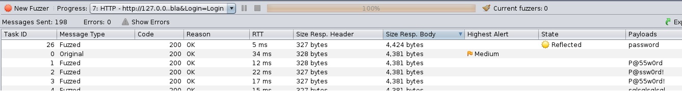 Once the Fuzzer has finished, we will have to sort the Size Response Body from highest to lowest (also interesting to see the State column) to see which is the correct password. In this case the pass is password.